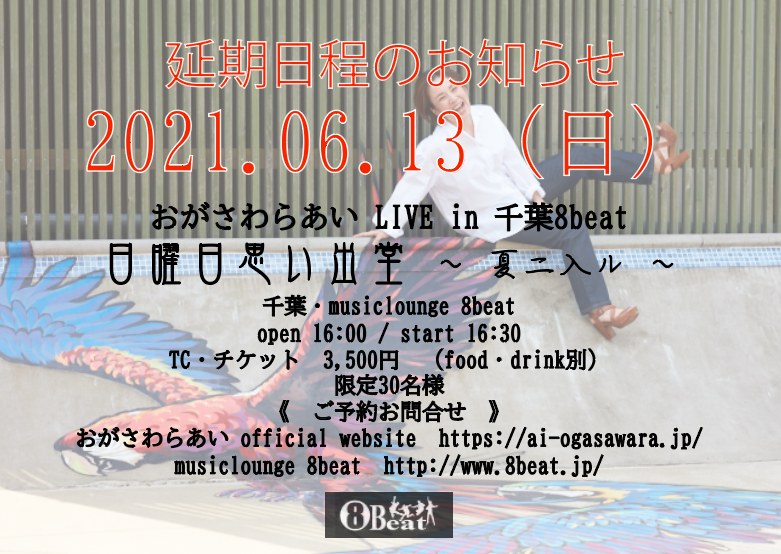 延期日決定のお知らせ・千葉8beat 【日時】2021/06/13(日) 【時間】開場 16:00 / 開演 16:30 【会場】千葉・music lounge 8beat 【住所】〒260-0021