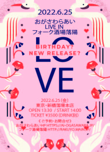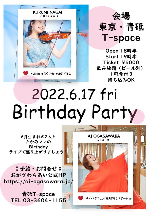 6/17(金)東京・青砥ライブ 『Birthday party!』 Open 18:30 / Start 19:30 TICKET ¥5000(飲み放題(ビール別)・軽食付き) 持ち込みOK 共演