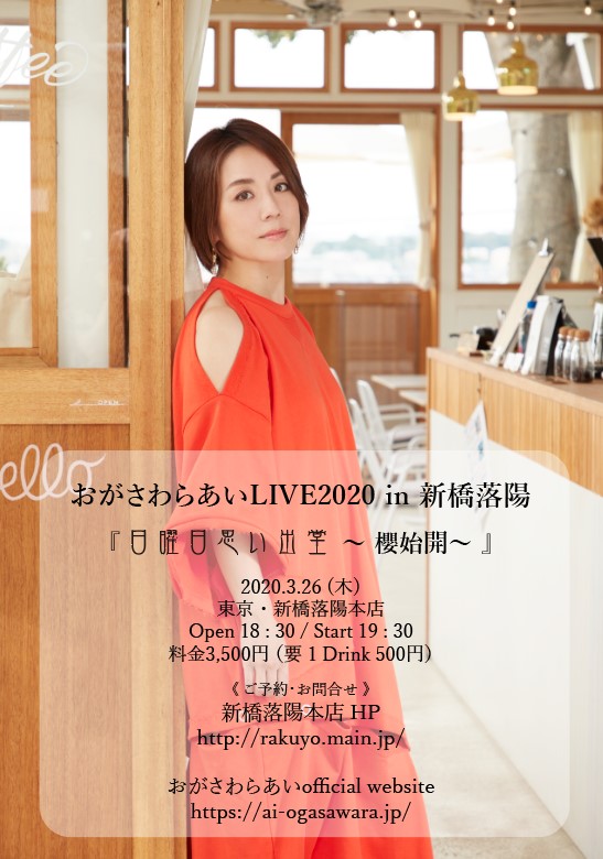 おがさわらあいLIVE2020 in 新橋落陽 『 日曜日思い出堂 ~ 櫻始開~ 』 2020.3.26 (木) 東京 ・ 新橋落陽本店 Open 18 : 30 / Start 19 : 3