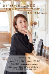 2/21青砥T-space SOLD OUT!! 東京・青砥T-space おがさわらあいLive2020 『日曜日思い出堂 ~二の替~』 2020.2.21 open 19 : 30 / start 20:30 ¥5,000・飲み放題&おつま