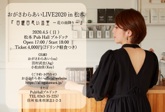 長野県・松本 『日曜日思い出堂 ~花の雨降り~ 』 おがさわらあいLIVE2020 in 新橋落陽 『 日曜日思い出堂 ~ 櫻始開~ 』 2020.3.26 (木) 東京 ・ 新橋落陽本店 Open 18 : 30 / Start 19 : 3