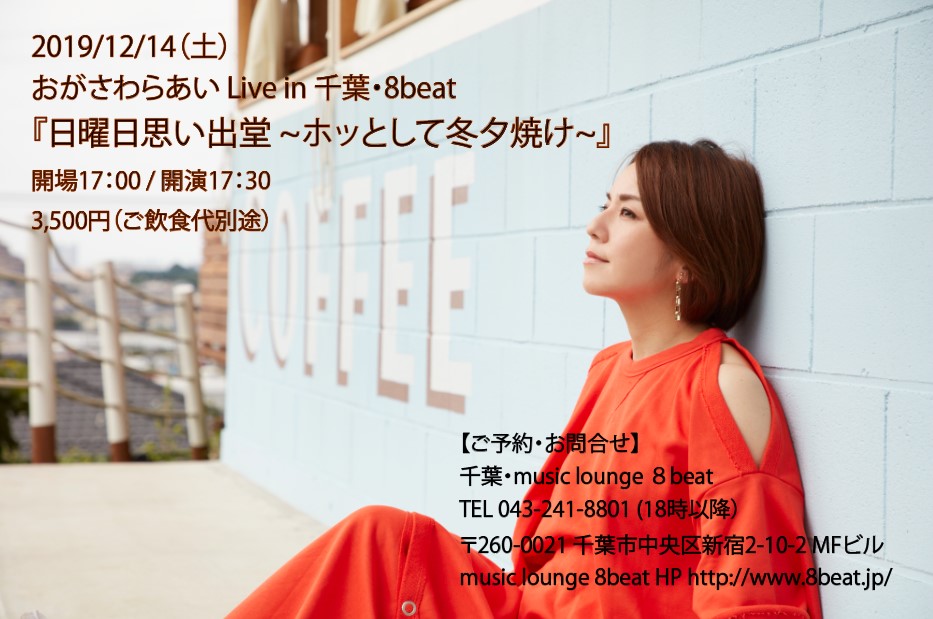 おがさわらあいLIVE in 8beat 『日曜日思い出堂 ~ホッとして冬夕焼~ 』 【日時】2019/12/14(土) 【時間】開場 17:00 / 開演 17:30 【会場】千葉・musi